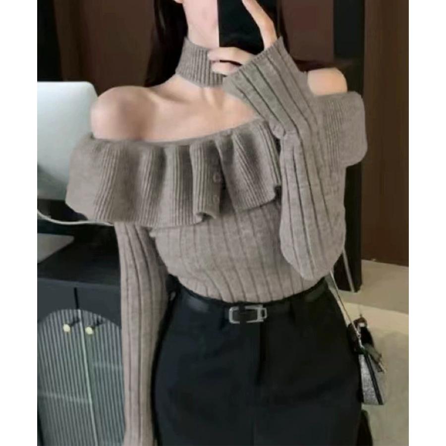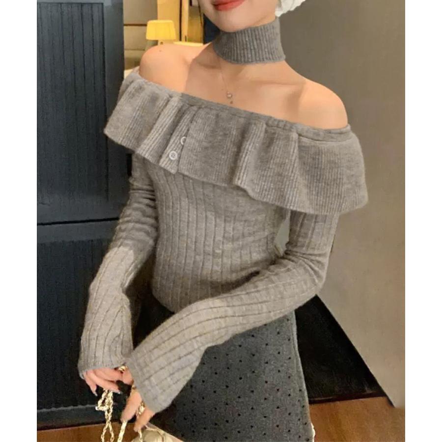 レディース 大人可愛い セパレートネック リブニットカットソー オフショルダー フリルニット着やせ 2WAYトップス春秋