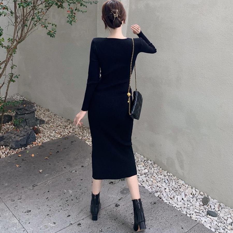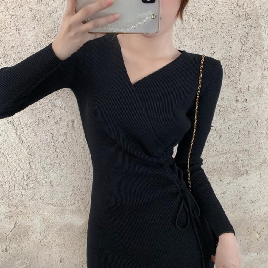 サイドレースアップ タイトワンピース 大人カジュアル 韓国風 ロングワンピース きれいめ ミモレ丈ワンピース 暖かい