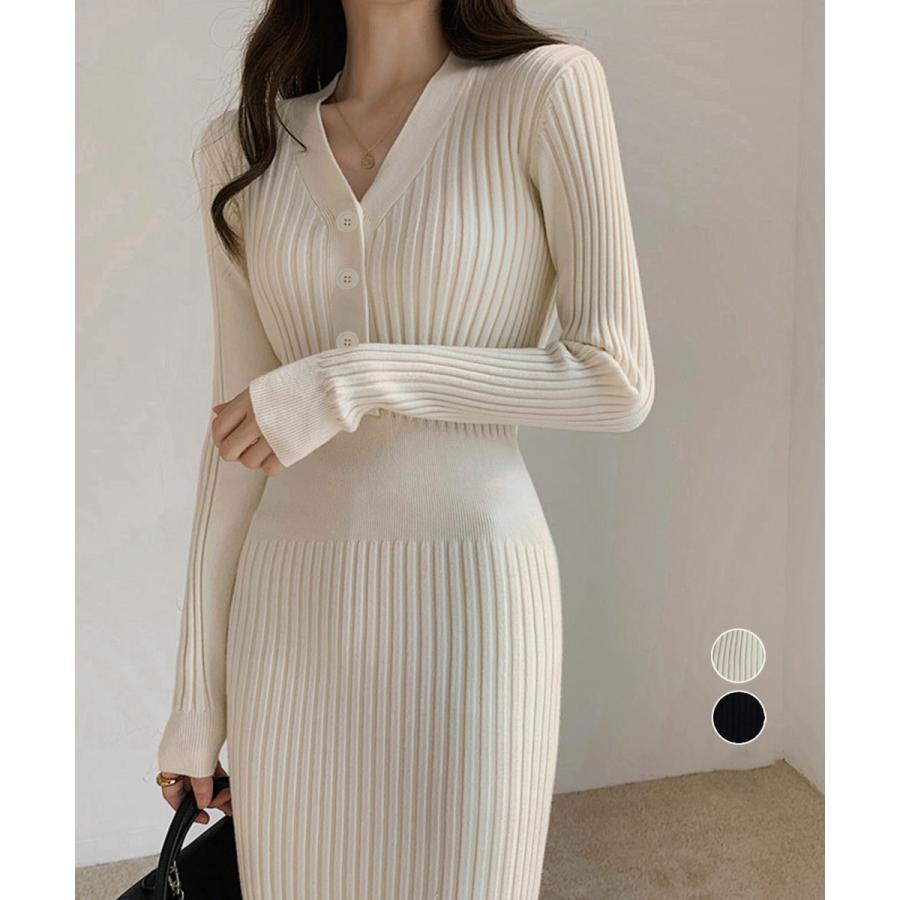 エレガントなタイトシルエットを引き立てるリブニットワンピース。