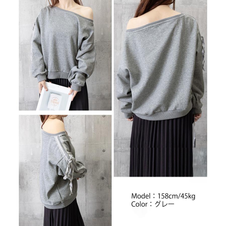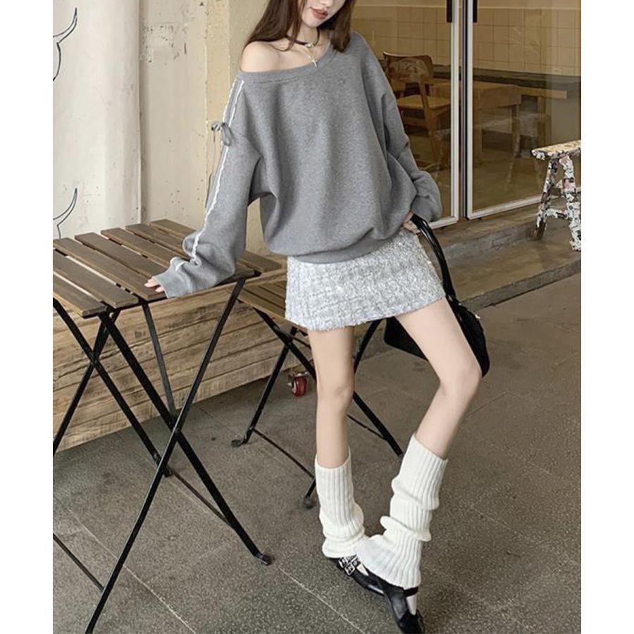 韓国風のカジュアルさとフェミニンさを兼ね備えたレディースオフショルダー長袖スウェット。