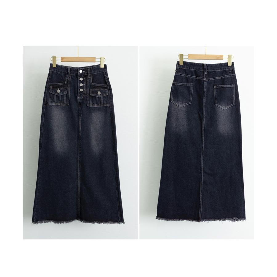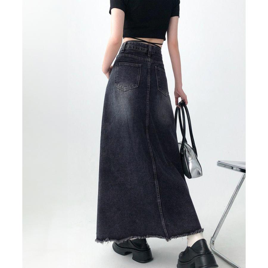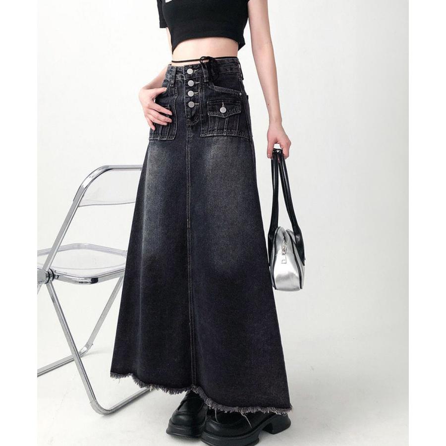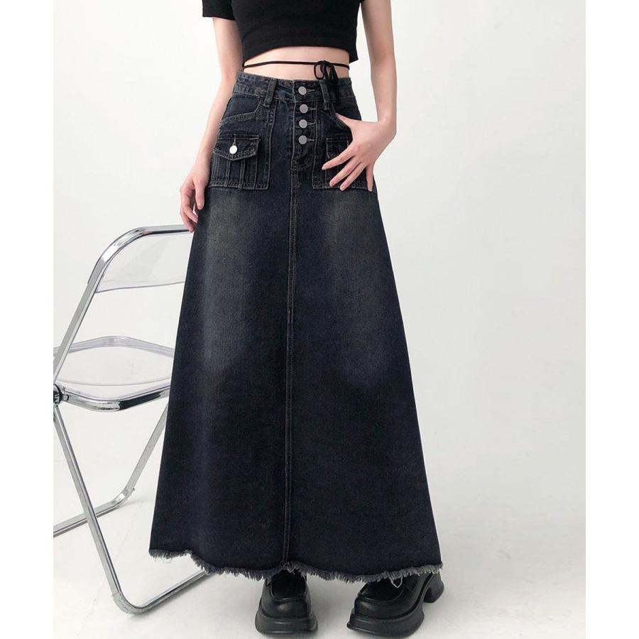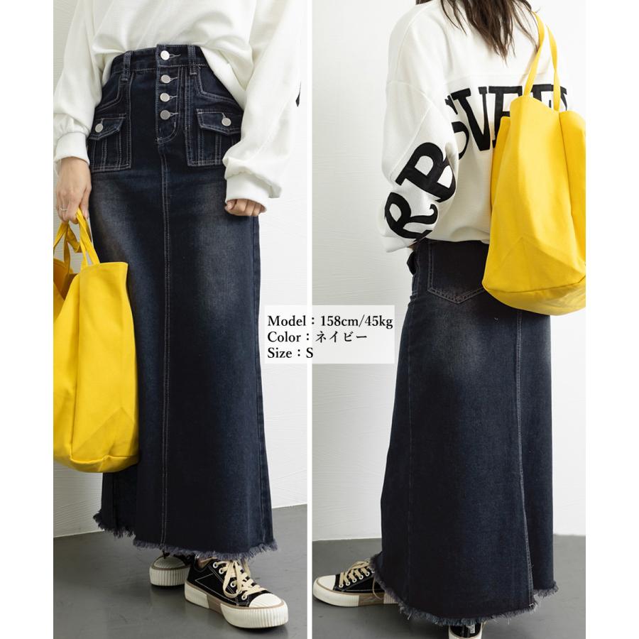レディース オシャレ ロングスカート 切りっぱなし Aラインスカート 体型カバー フリンジ 着やせデニム ヴィンテージ風