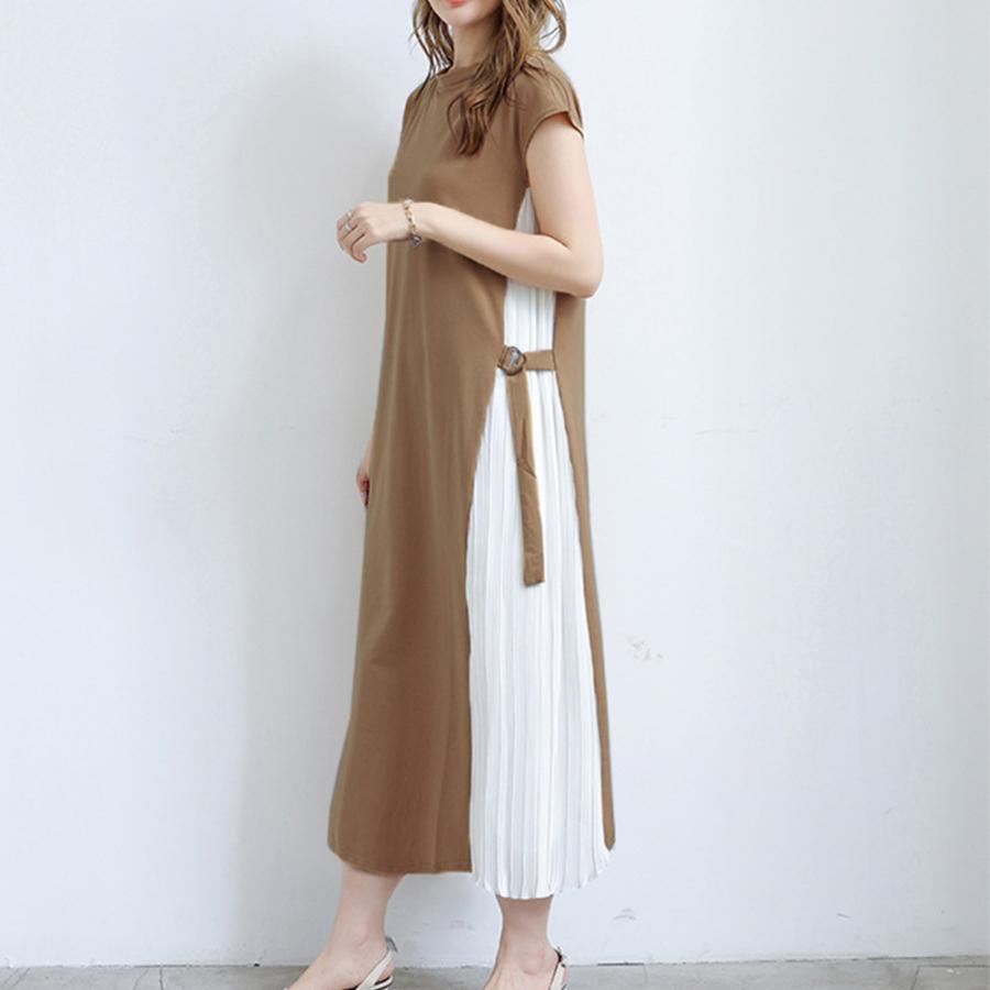 半袖ロングワンピース 配色ワンピ オフィス カジュアル 大人かわいい Aライン フレア シンプル 体型カバー 通勤