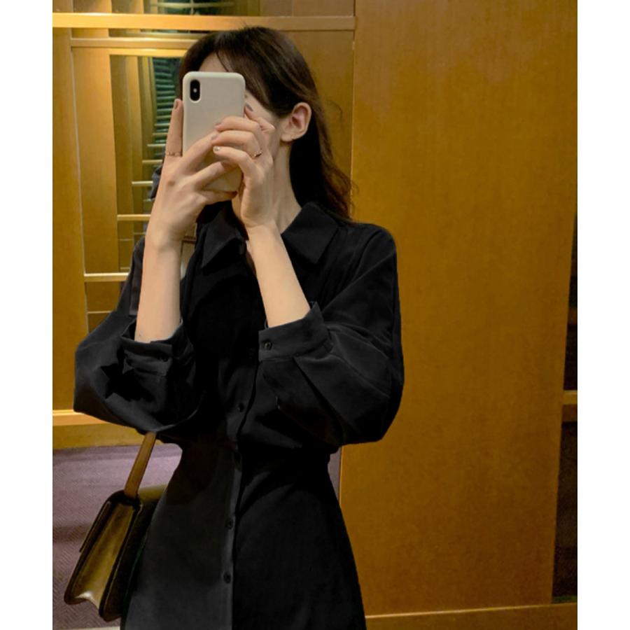 優雅なボリュームスリーブが特徴的な、韓国女優風のロング丈シャツワンピース