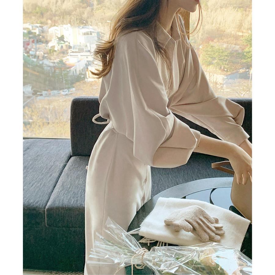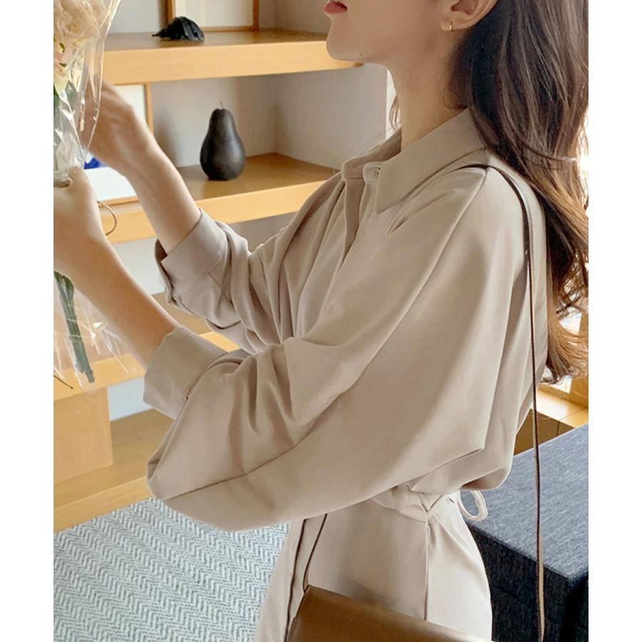 優雅なボリュームスリーブが特徴的な、韓国女優風のロング丈シャツワンピース