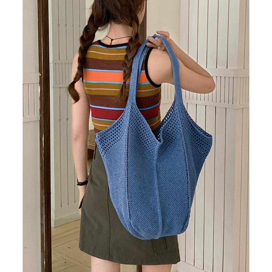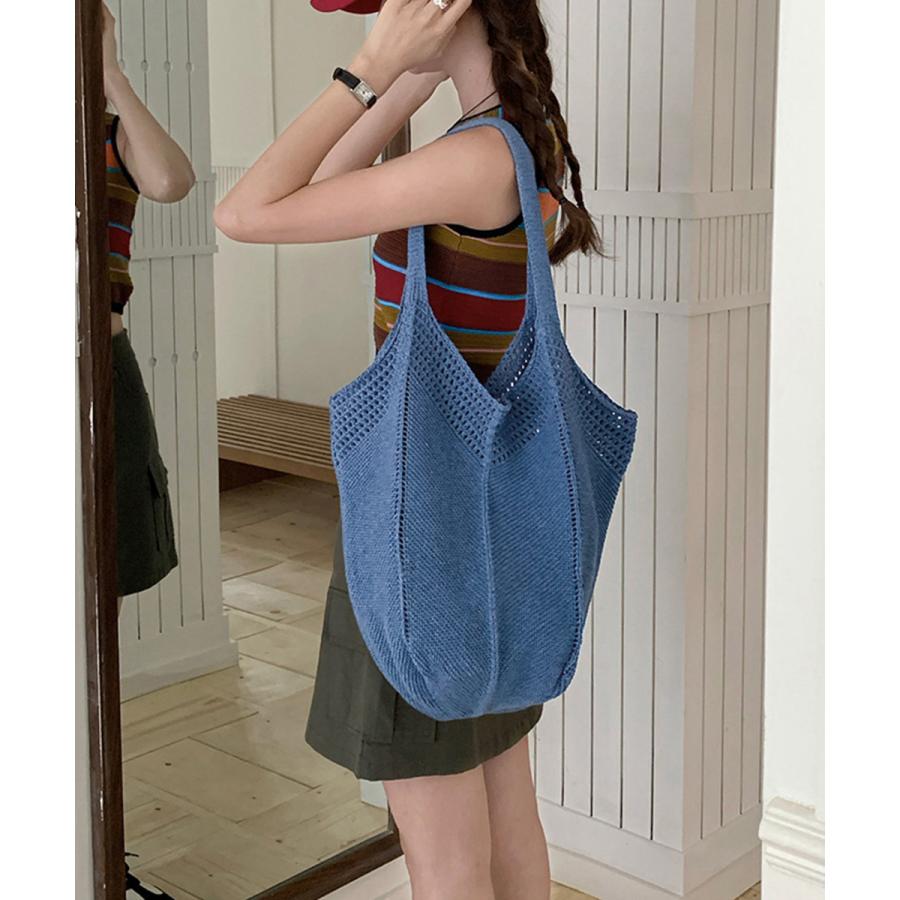大きめナチュラルバッグ 透かし編みニット鞄 A4収納可 大人カジュアルサマーバッグ 韓国風カバン シンプル手提げバッグ