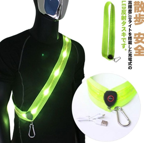 高輝度LEDライトを搭載した充電式のLED反射タスキです。