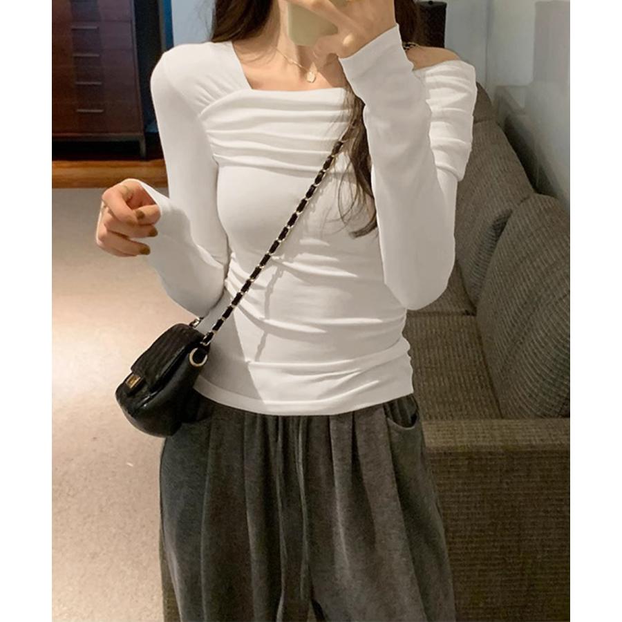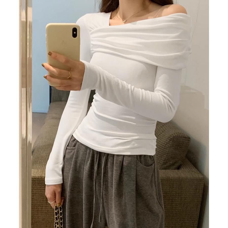 レディース 大人カジュアル タイトTシャツ 韓国風 片方オフショルダーカットソー サイドギャザー セクシーtシャツ 無地