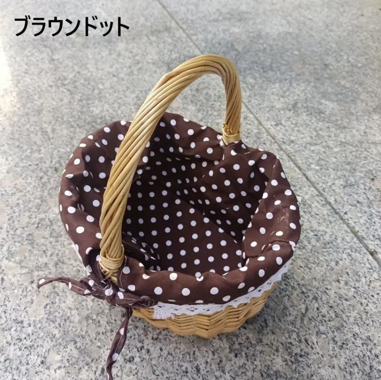 ■商品説明 かわいいお洒落なピクニックバスケットが登場しました♪ ピクニックに持っていくと雰囲気が上がってピクニックが一層楽しくなりますよ! ピクニックに合うだけでなくお野菜を入れたり、果物を入れたりして保管してもとってもお洒落でかわいいですよ。 お買い物に持って行っても気分が上がること間違いなしです。 ■サイズ 幅24cm x 奥行き21cm x 高さ13cm ■カラー(5カラー) ①ブラウンドット ②ブラウンギンガム ③レッドギンガム ④デイジー ⑤英字 ■素材 枝