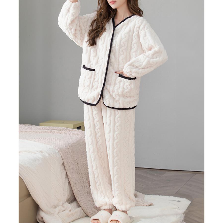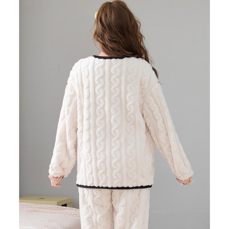 ケーブル柄ルームウェア セットアップ ポケット付き ふわふわ部屋着 軽く暖かい 長袖寝巻き もこもこボアパジャマ 冬防寒