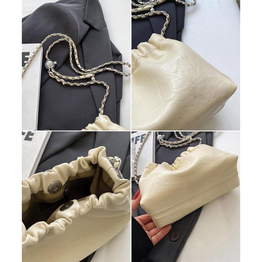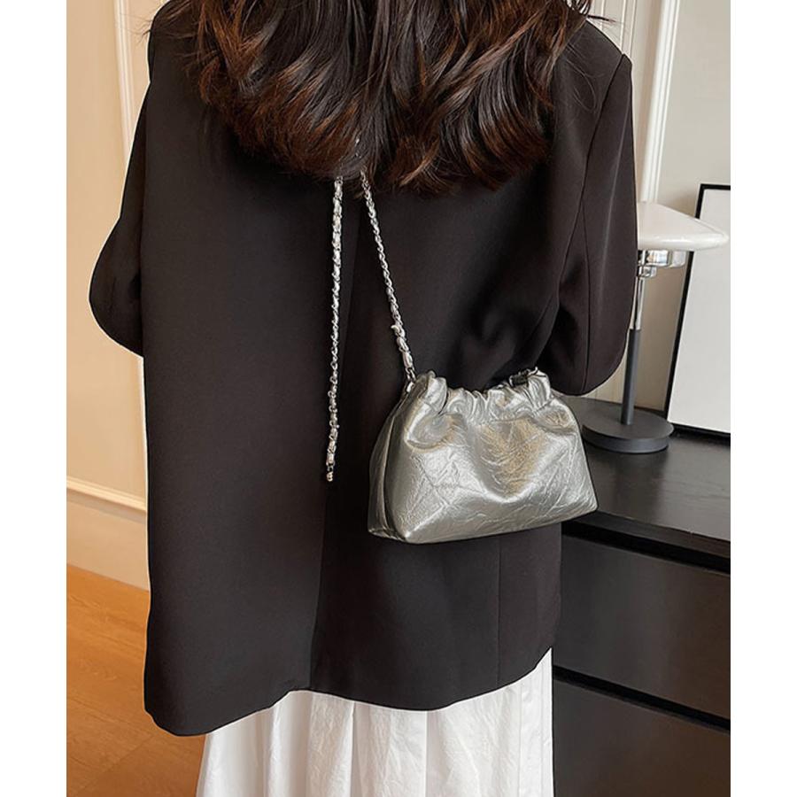上品な光沢感とエレガントなデザインが魅力のモダンな巾着型ショルダーバッグ。