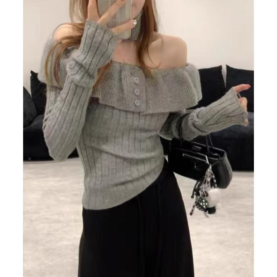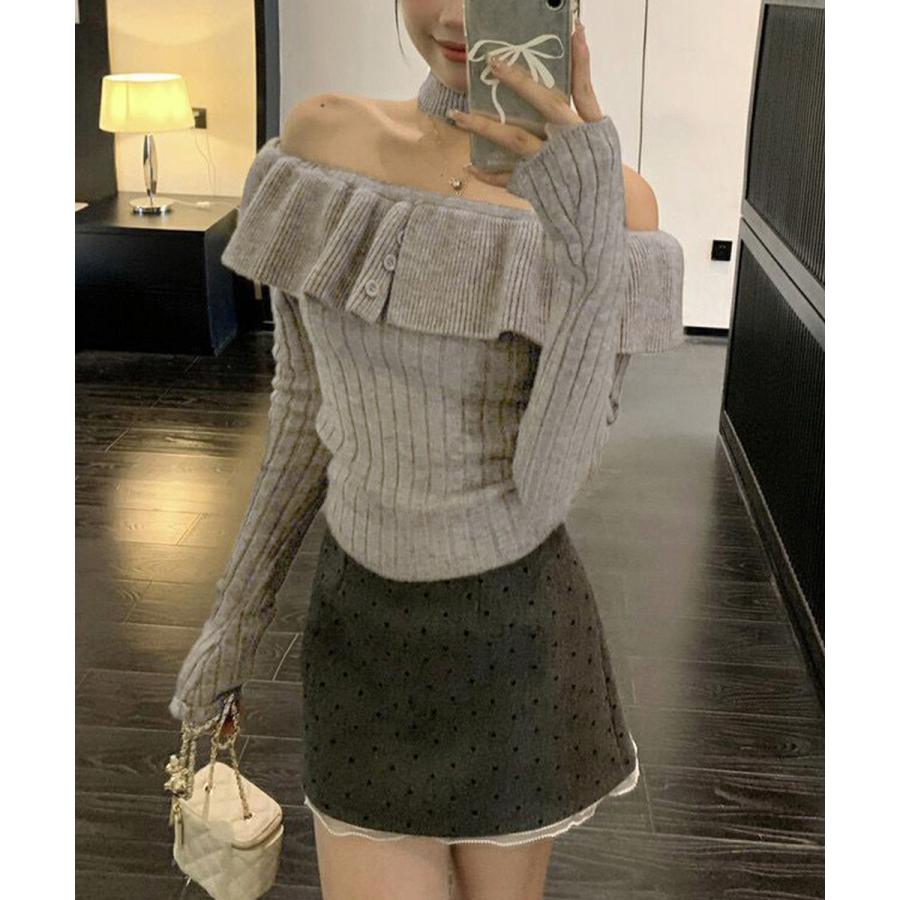 レディース 大人可愛い セパレートネック リブニットカットソー オフショルダー フリルニット着やせ 2WAYトップス春秋