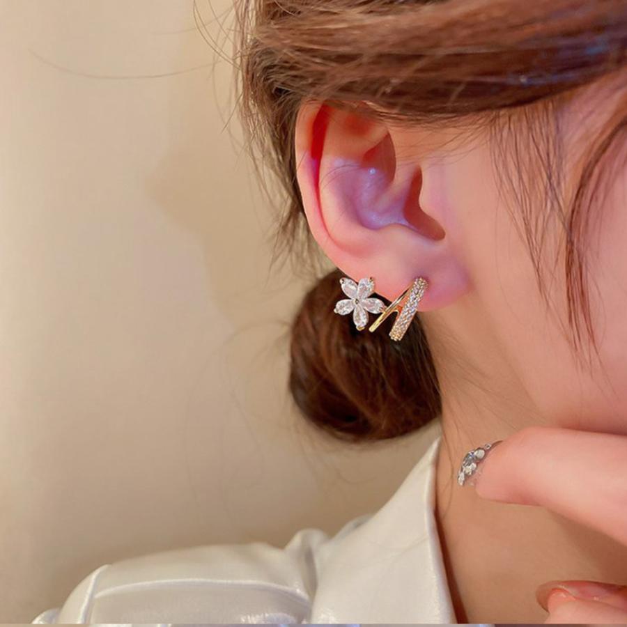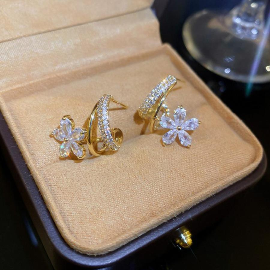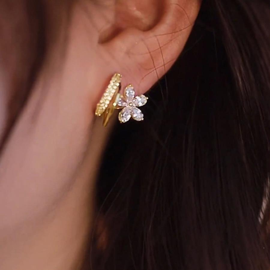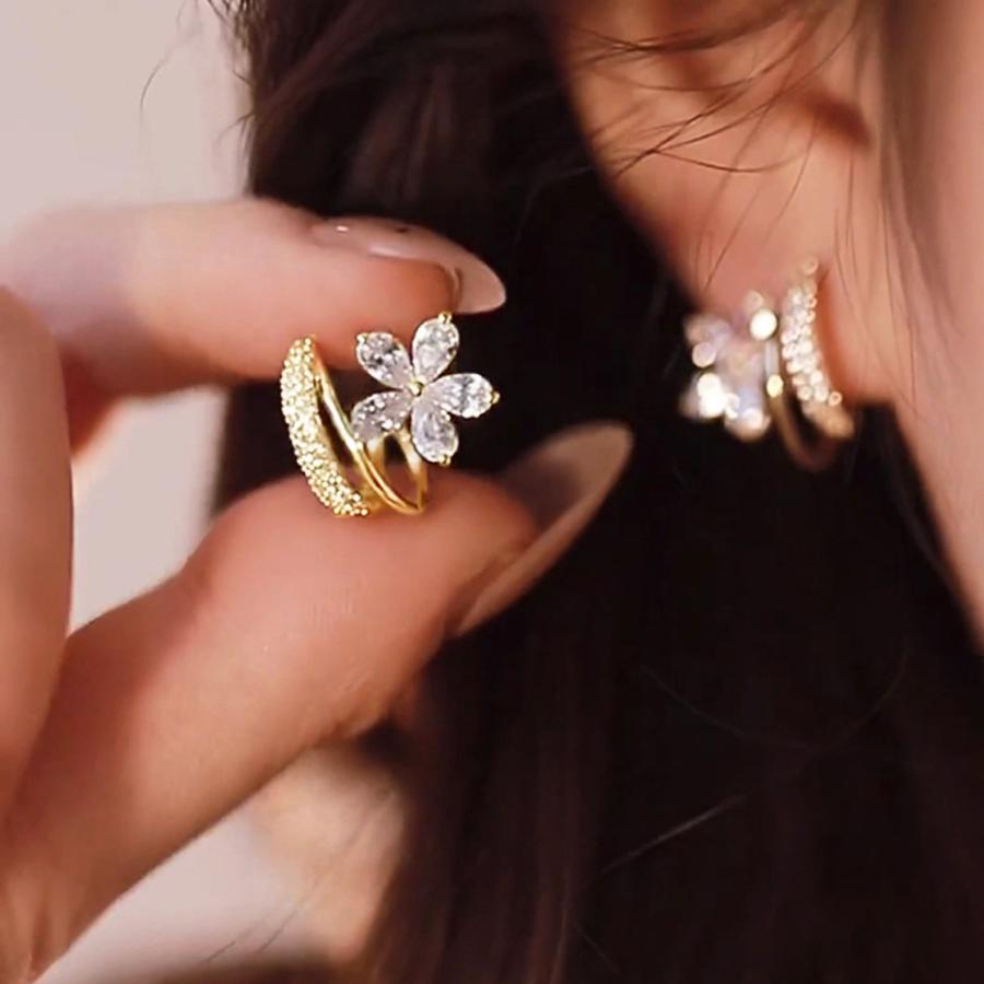 キラキラ輝くラインストーンに大振りの花モチーフのフェミニンピアス