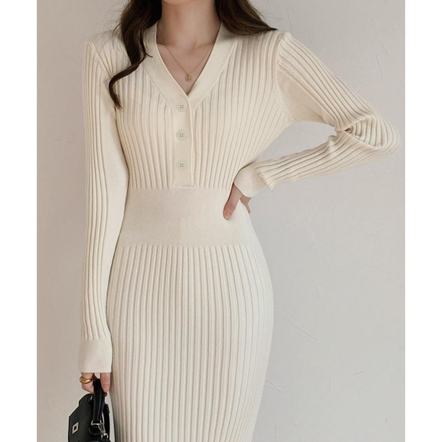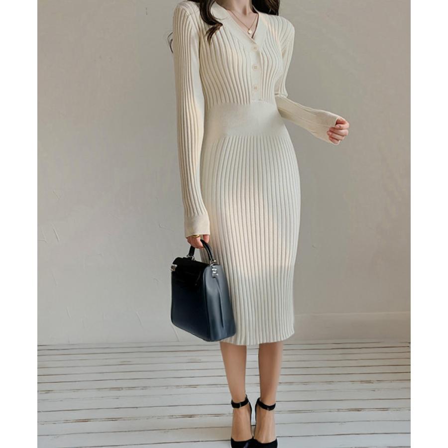 エレガントなタイトシルエットを引き立てるリブニットワンピース。
