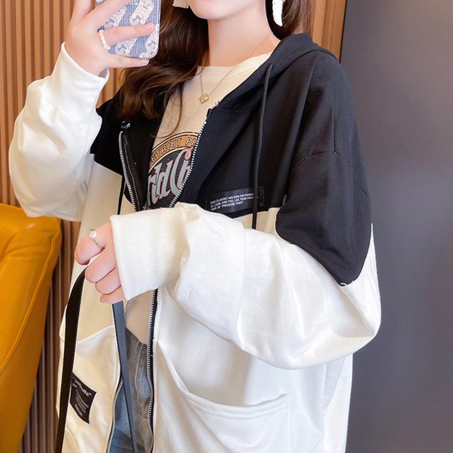 フード付きトレーナー長袖 ゆったり 韓国 薄手フーデッド 体型カバートップス おしゃれバイカラーパーカー ストリート春秋