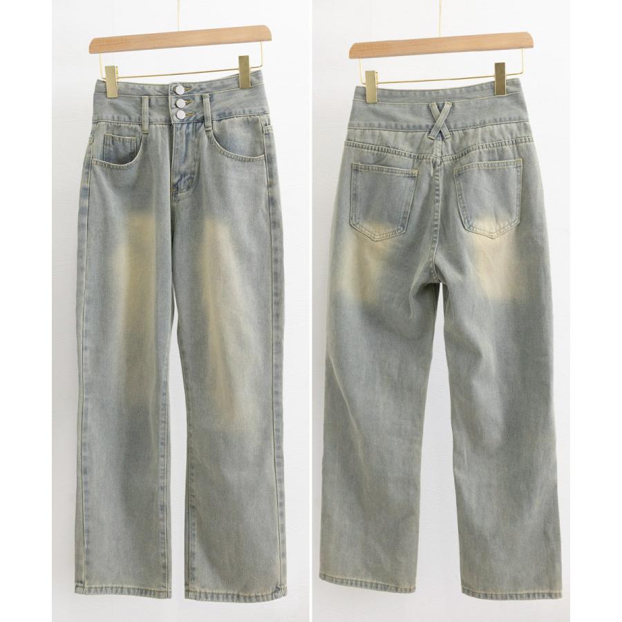 美脚ストレートパンツ 着やせ セミワイドパンツ ボタン付き ジーパン 高く見え ロングズボン オシャレ カジュアルパンツ