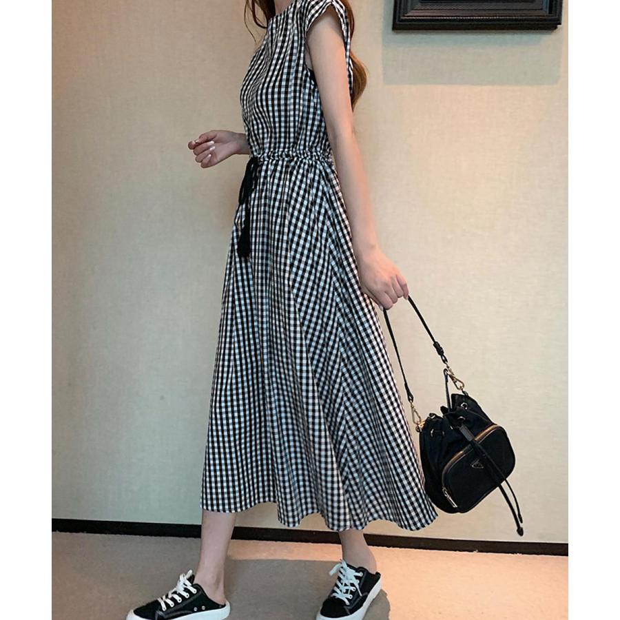 フレンチスリーブ チェック柄 ロングワンピース ハイウエスト Aラインワンピース クルーネック 体型カバー 綿麻風ワンピ
