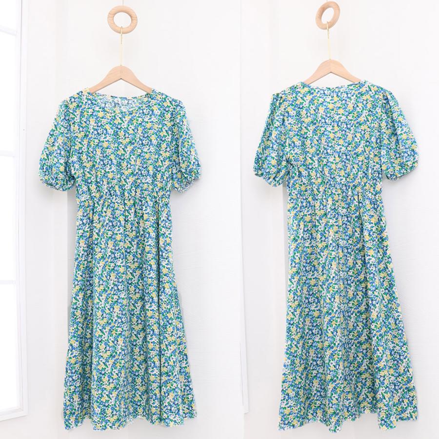大人可愛い リゾートワンピース クルーネック 総柄 パフスリーブ 半袖 サマーワンピ フラワー柄 体型カバー きれいめ