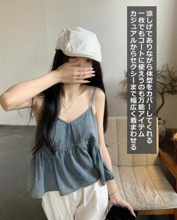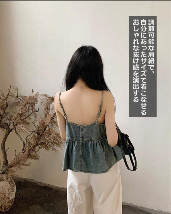 デニムキャミソール ペプラム レディース ベスト ミドル丈 軽量 体型カバー 薄手 トップス 袖なし 重ね着 デニム アウター キャミ ショット丈 ノースリーブ デニム Vネック キャミソール カットソー レイヤード おしゃれ qiandai01 【品 番】qiandai01 【カラー】図色 涼しげでありながら体型をカバーしてくれる 一枚でもコートに使えうのも万能アイテム カジュアルからセクシーまで幅広く着まわせる 簡単な飾りに合わせてコーデ完成 程よく広がったペプラムシルエット どんなボトムスとも合わせやすいのが魅力的 調節可能な肩紐で、 自分にあったサイズで着こなせる おしゃれな抜け感を演出する 【商品情報】 ■サイズ(cm) 表示サイズ:S/M/L S:バスト:80cm 服丈:37 M:バスト:84cm 服丈:38 L:バスト:88cm 服丈:39 ■備考 【素材】ポリエステル 【裏地】なし 【伸縮性】なし ※寸法は手測りなので若干誤差がございますが、ご了承くださいませ。 ※お品物の色合いは、写真撮影、パソコン画面表示等の環境の違いにより、若干異なる場合がございますので予めご了承くださいませ。