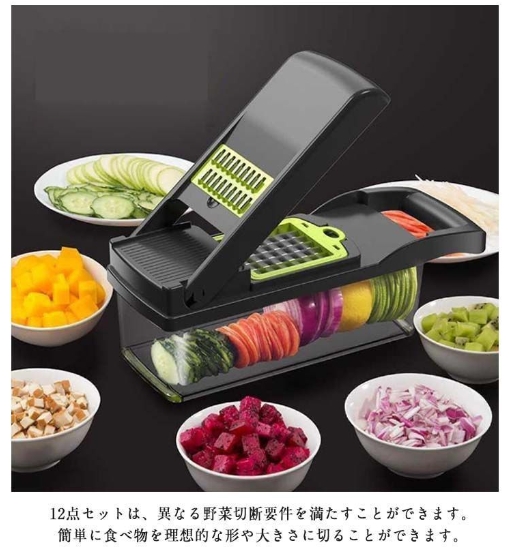 多機能スライサー。12点セットは、異なる野菜切断要件を満たすことができます。簡単に食べ物を理想的な形や大きさに切ることができます。