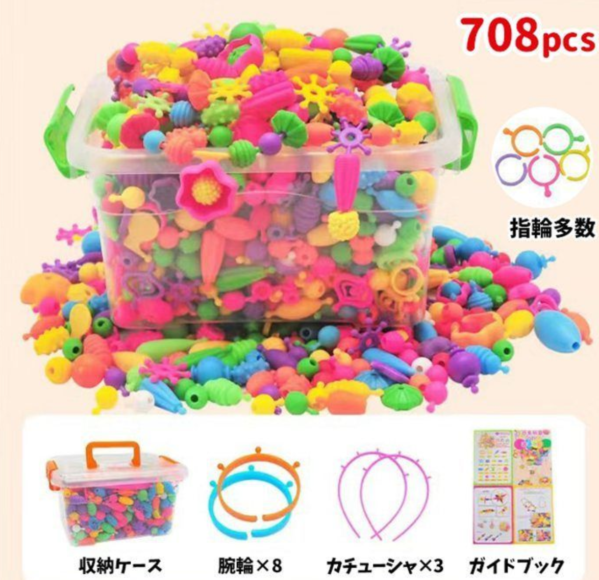 内容:アクセサリーパーツ708個、収納ケース、ガイドブック 素材:PP/PE 商品説明: ハサミ不要のアクセサリーセット「スナッピンビーズ」 パーツをパチンとはめ込むだけ!ハサミや糸を使わないで作れるのでケガの心配のないアクセサリーキットです。 カチューシャや腕輪、指輪の土台が入っているので、色々なアクセサリーを作っていただけます。 ★楽しみながら知育できるオモチャ 自分で考えてアクセサリーを作ることで、お子様の創造力、認識能力、思考能力、集中力などを高めます。作ったアクセサリーでプリンセス気分のごっこ遊びも楽しめます。 ご注意: ※小さなお子さまが遊ぶ場合は、保護者の方の目の届くところでお願いします。 ※商品画像はご覧になっているモニターやPCなどの環境、解像度により、実物と多少カラーが異なる場合がございます。色味やサイズが異なるなどのクレームはご対応致しかねますので、予めご了承ください。 ※輸送中に外装に傷やへこみが起こる場合がございますが、商品に影響はございませんので、予めご了承のもとお買い求めください。 ※本商品は海外からの輸入品ですので、細かい傷や汚れなどある場合がございます。予めご了承のもとお買い求めください。