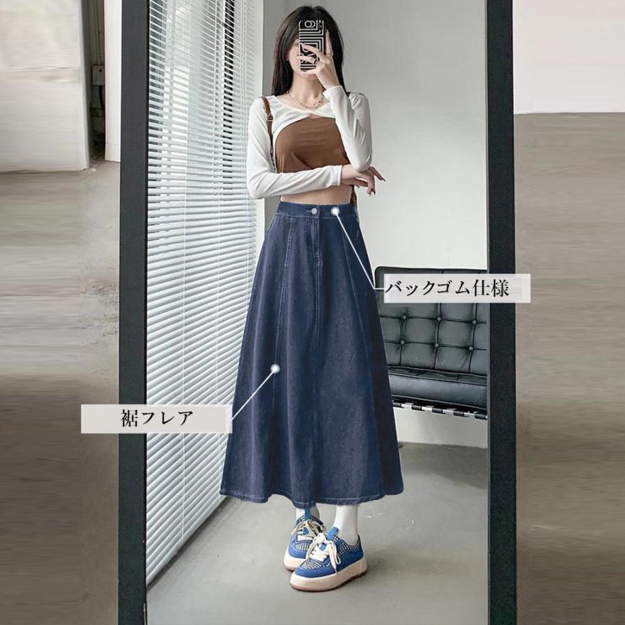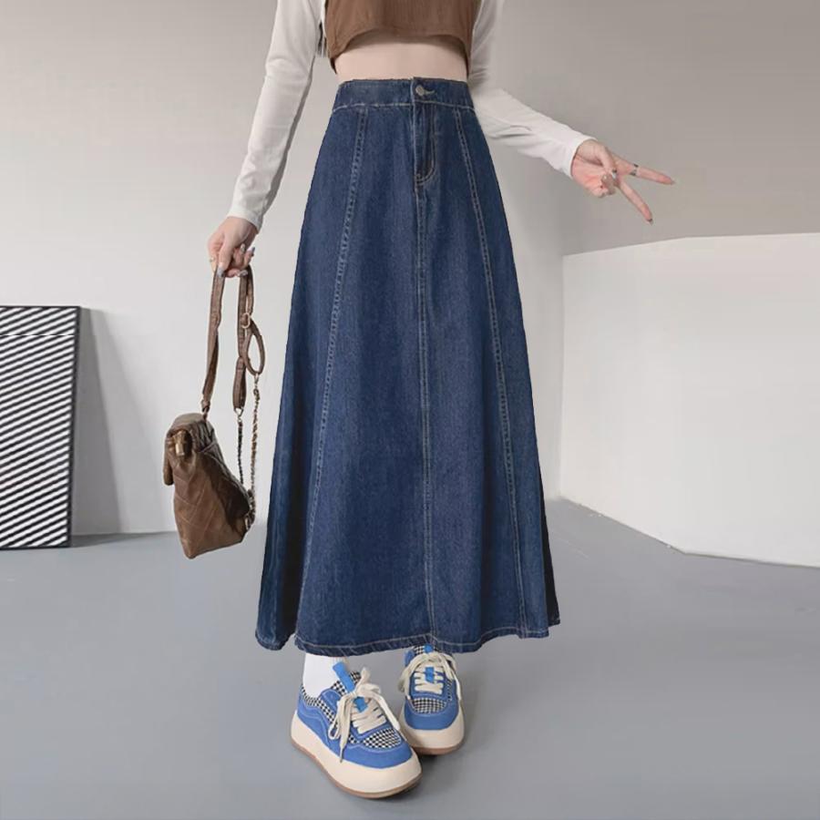 カジュアルコーデにもぴったりの長め丈のフレアデニムスカート