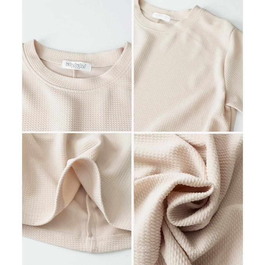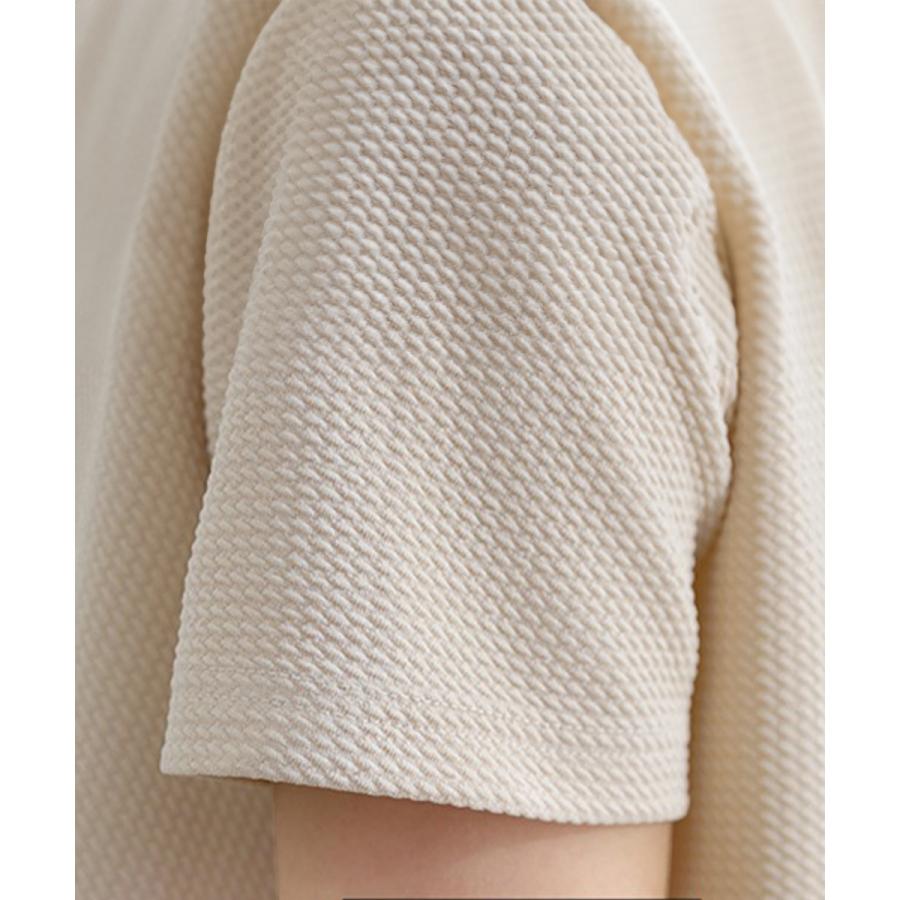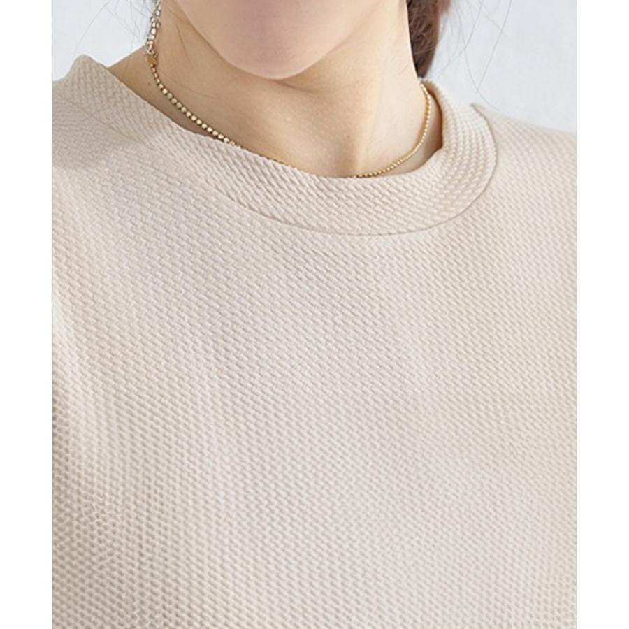 襟は詰まり過ぎない絶妙な開きのクルーネックで、首元がすっきり見える