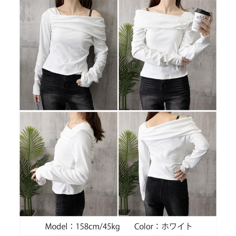 アシンメトリーデザインが目を引く、オフショルダーのフィットトップス。